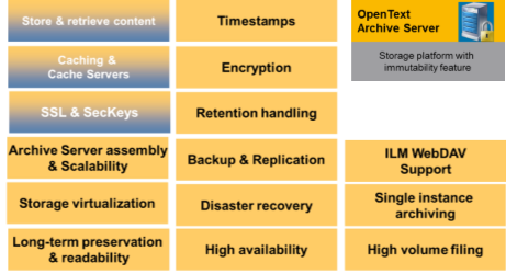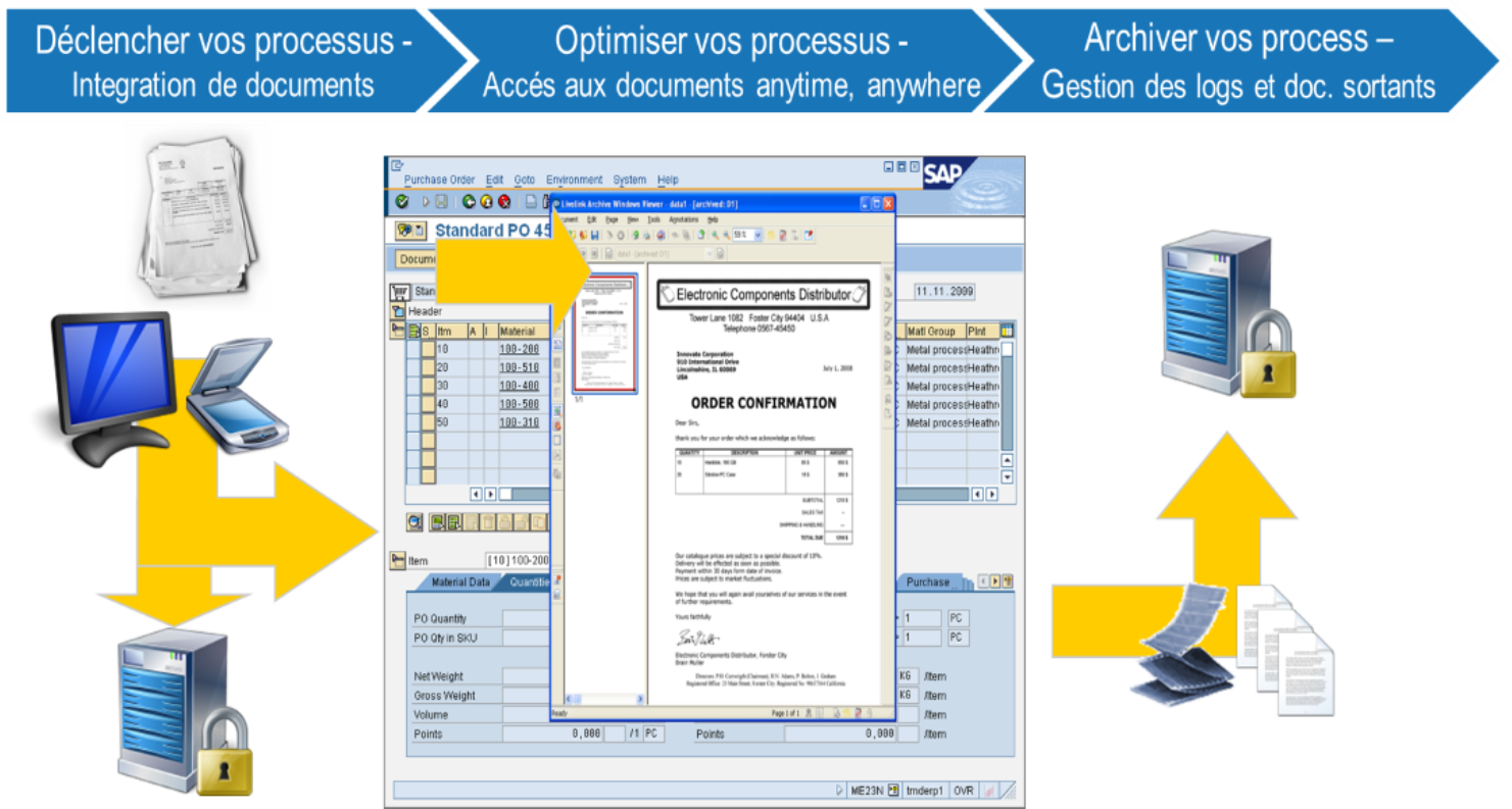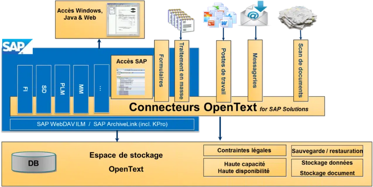 Les solutions OpenText Archiving for SAP solution (SAP Archiving) et Document Access for SAP solution (SAP Document Access) permettent de mettre en place des solutions complètes afin de répondre à ces besoins.