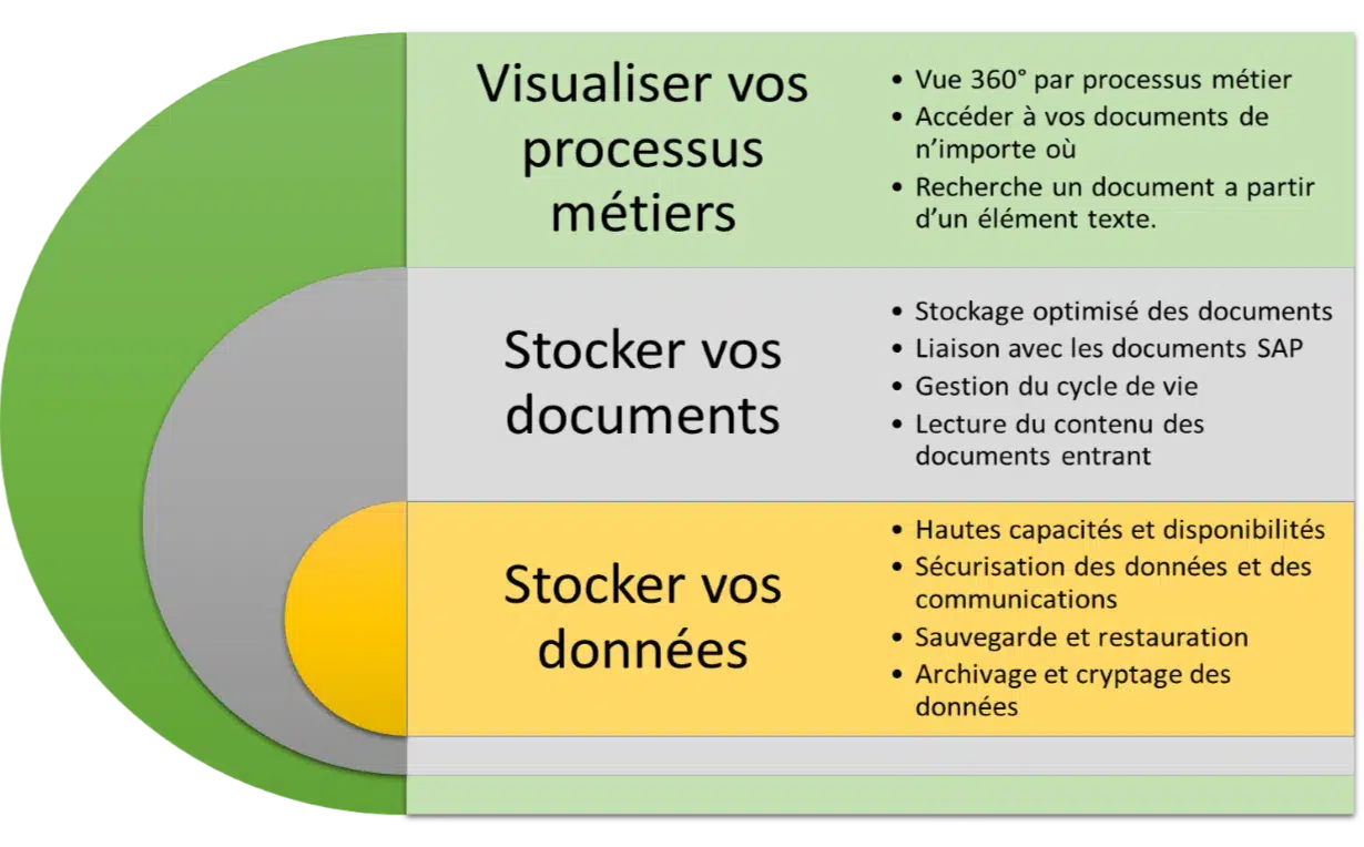 Ces solutions permettent la mise en place d’un environnement de stockage maîtrisé, à la fois pour les données SAP et pour tous les documents de votre société. Cela permet une réduction des coûts d’infrastructure et de maintenance tout en permettant d’avoir un environnement performant pour les utilisateurs.