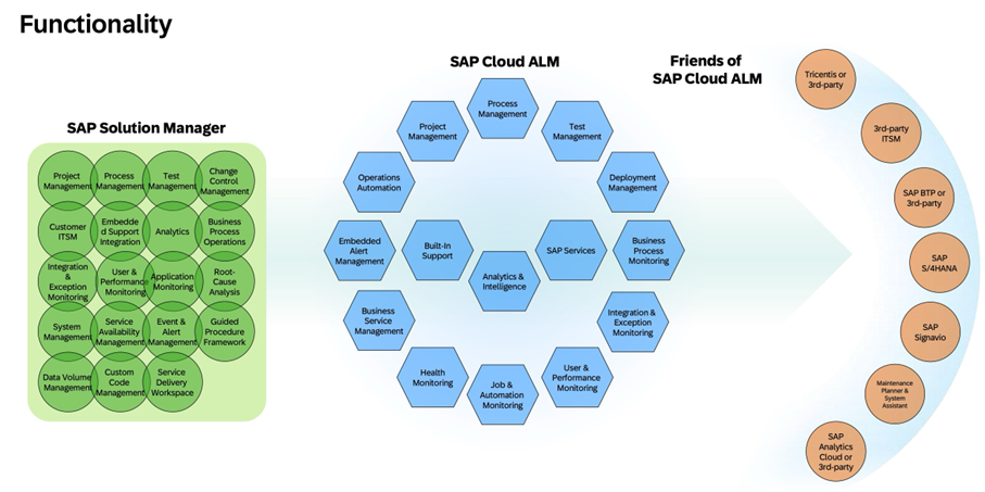 SAP propose une transition fluide vers une gestion moderne et optimisée des solutions grâce à SAP Cloud ALM. En comparant cette plateforme avec SAP Solution Manager, l’image ci-dessus illustre l’évolution des fonctionnalités et la puissance des intégrations avec des outils tiers, appelés Friends of SAP Cloud ALM.