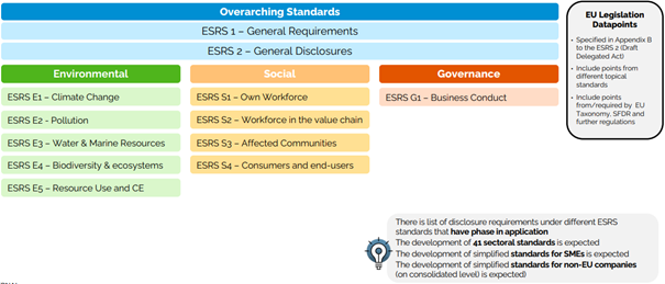 La CSRD spécifie le besoin de développement de normes de durabilité devant s’appliquer en Europe : les ESRS (European Sustainability Reporting Standards) adoptés par la Commission Européenne le 31 juillet 2023 fournissent les besoins d’information en termes de contenu « fonctionnel » (12 standards : ESRS1, etc…) et d’axes (gouvernance, stratégie, impacts, gestion des risques et opportunités, métriques et objectifs).